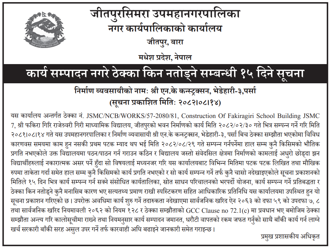 कार्य सम्पादन नगरे ठेक्का किन नतोड्ने सम्बन्धी १५ दिने सूचना ।