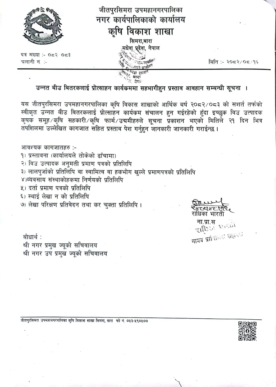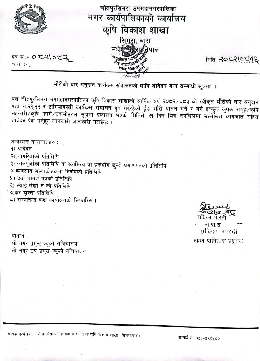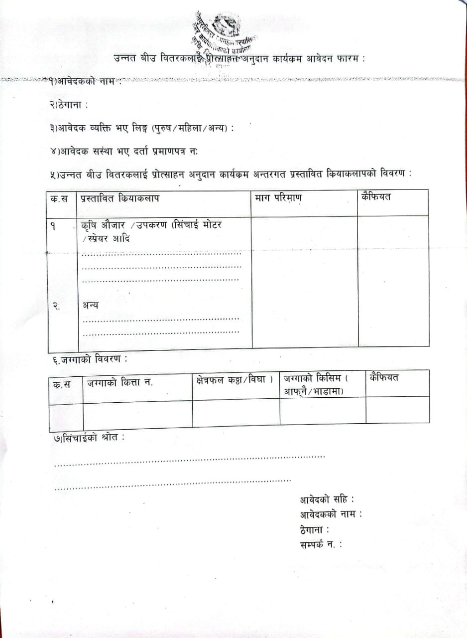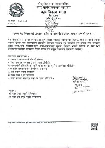 » मौरीको घार अनुदान कार्यक्रम संचालनको लागी आवेदन माग तथा उन्नत बीउ बितरकलाई प्रोत्साहन कार्यक्रम सहभागीहुन प्रस्ताव आवहान सम्बन्धी सूचना ।