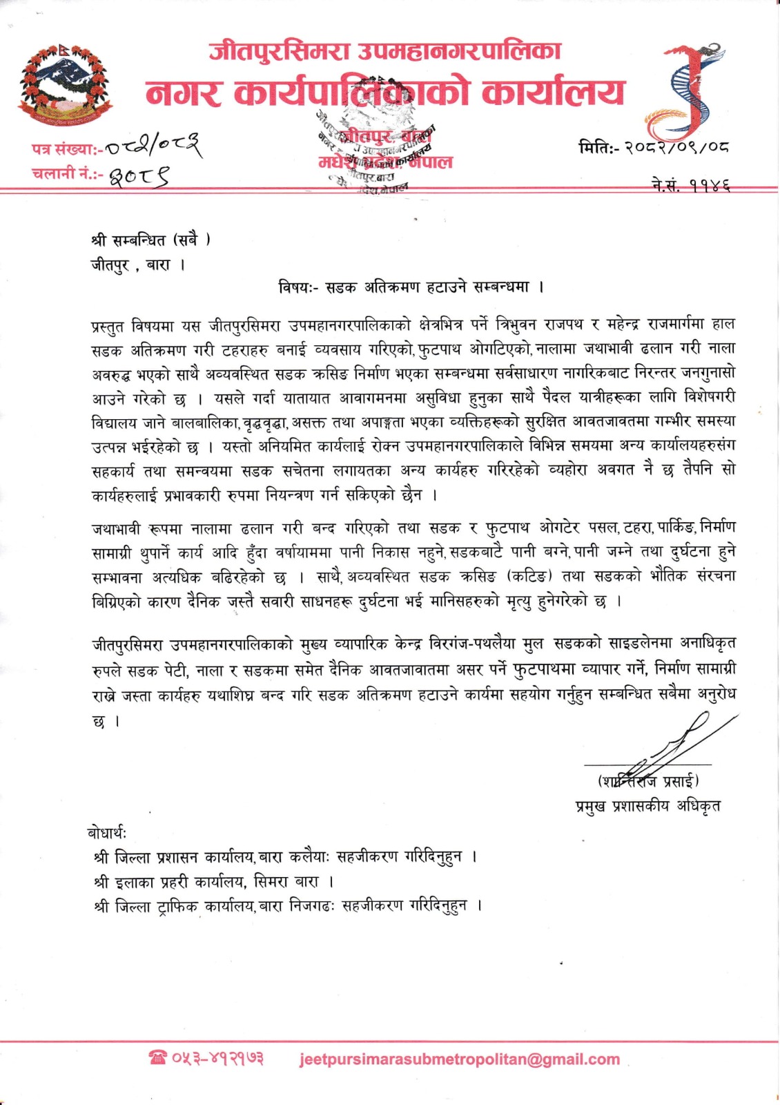 » श्री सम्बन्धित (सबै), सडक अतिक्रमण हटाउने सम्बन्धी सूचना ।