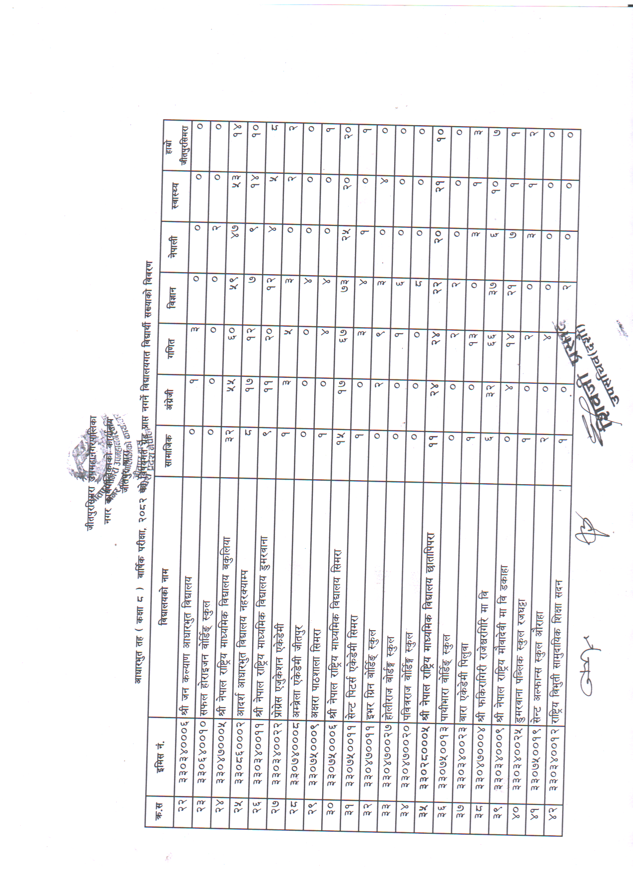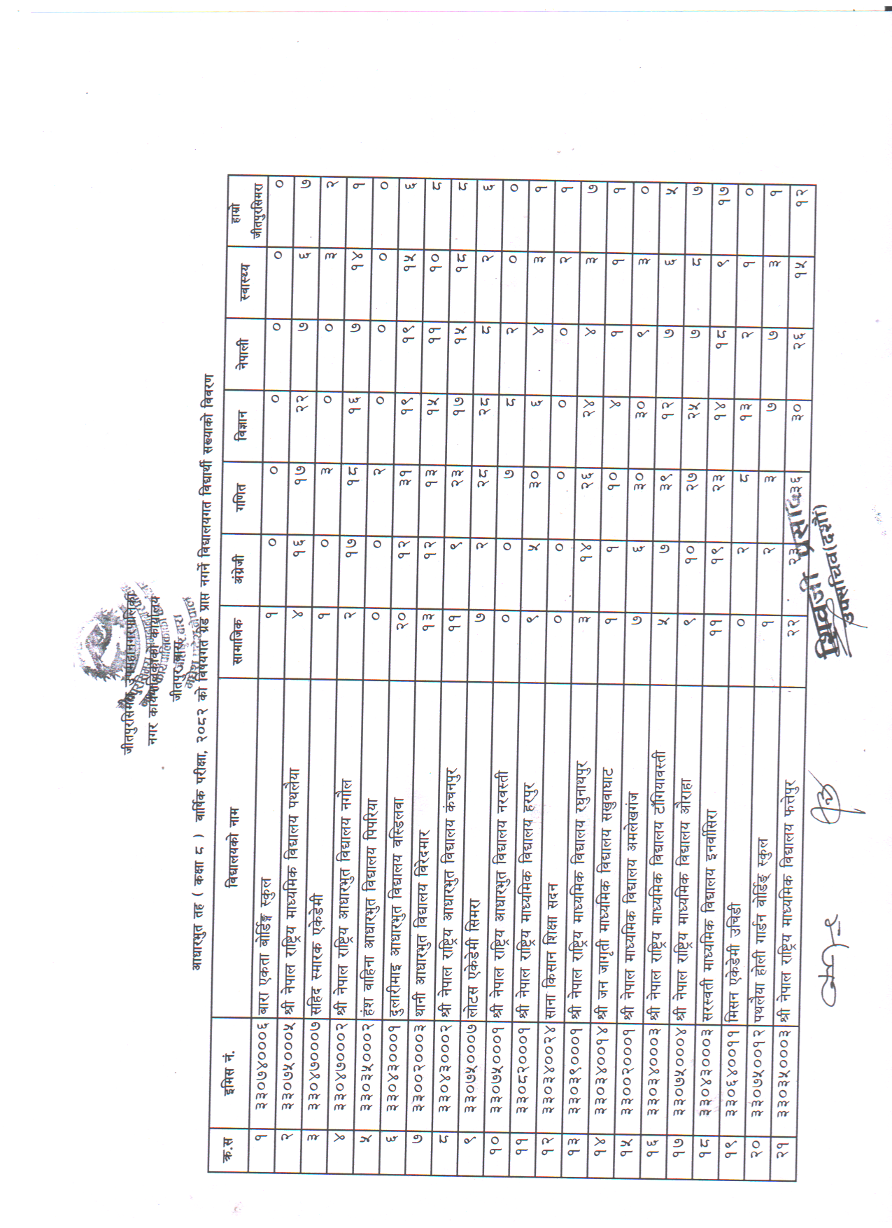 आधारभूत तह (कक्षा ८) बार्षिक परीक्षा, २०८२ को विषयगत ग्रेड प्राप्त नगर्ने विद्यालयगत विद्यार्थी सख्याको विवरण ।