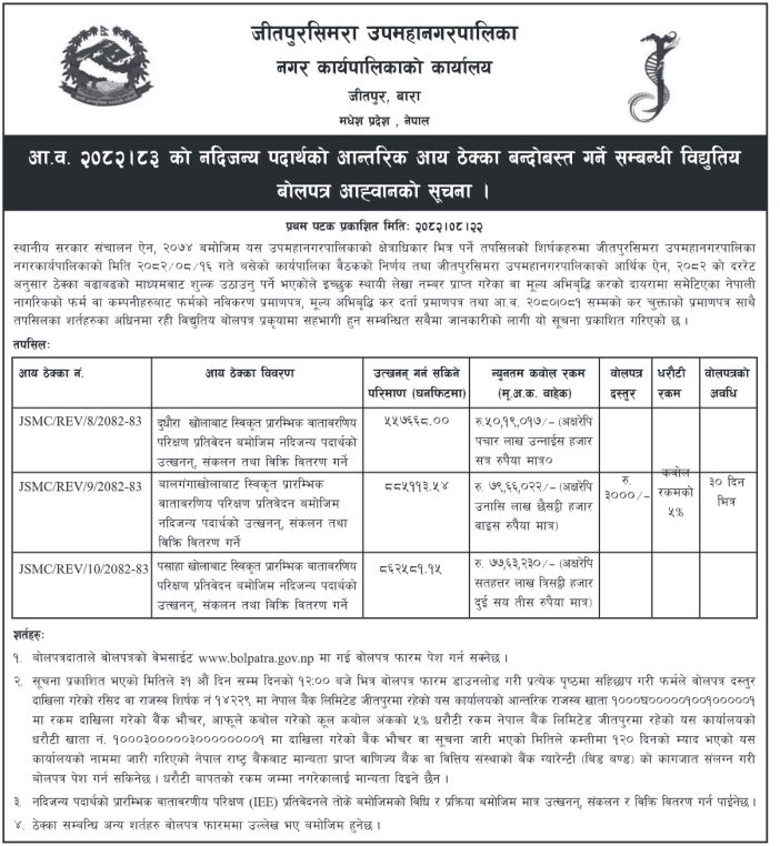 आ.व २०८२।८३ को नदिजन्य पदार्थको आन्तरिक आय ठेक्का बन्दोबस्त गर्ने सम्बन्धी विद्युतिय बोलपत्र आह्वानको सूचना ।