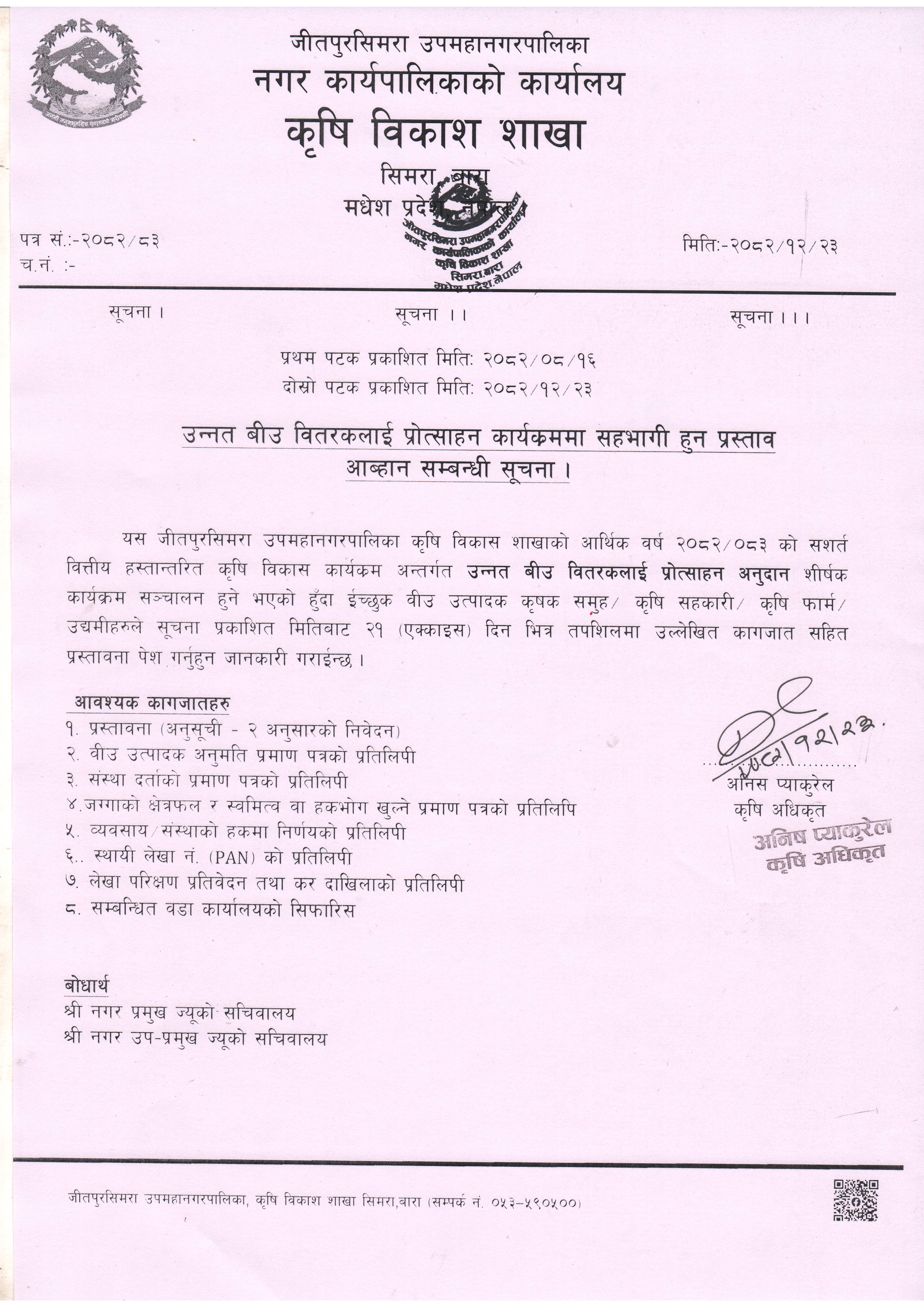 उन्नत बीउ वितरकलाई प्रोत्साहन कार्यक्रममा सहभागी हुन प्रस्ताव आव्हान सम्बन्धी सूचना ।