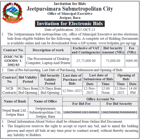 डेस्कटप कम्प्यूटर,ल्यापटप तथा प्रिन्टर खरिदको लागी बोलपत्र आह्वान सम्बन्धी सूचना ।