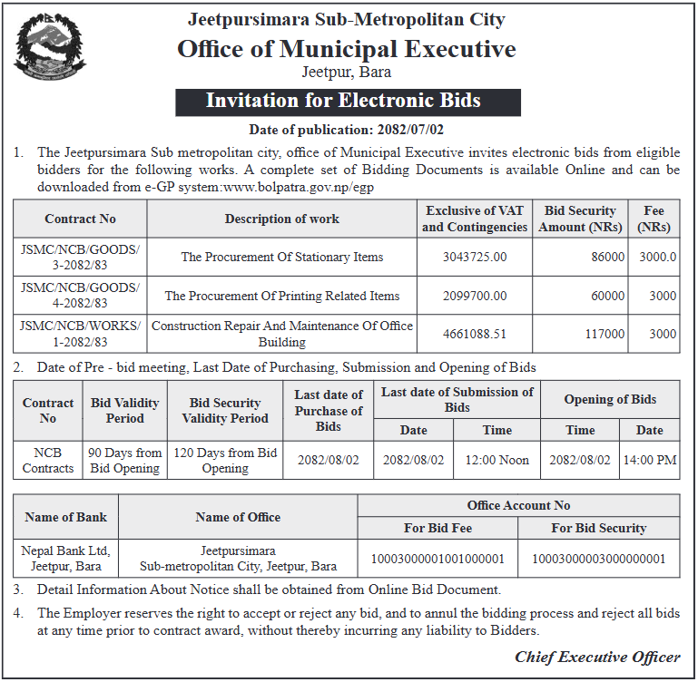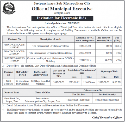 बोलपत्र आह्वान सम्बन्धी सूचना ।