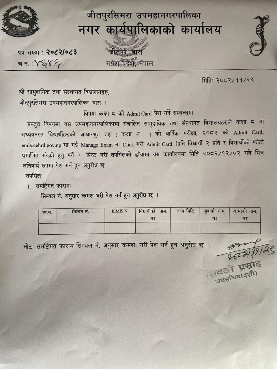 श्री सामुदायिक तथा संस्थागत विद्यालयहरु, कक्षा ८ को Admit Card पेश गर्ने सम्बन्धी सूचना ।