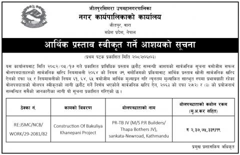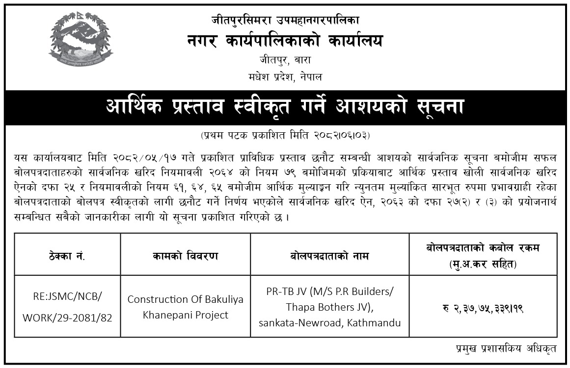 आर्थिक प्रस्ताव स्वीकृत गर्ने आशयको सूचना।