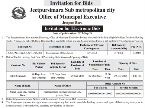 औषधि खरिदको बोलपत्र आह्वान सम्बन्धी सूचना ।