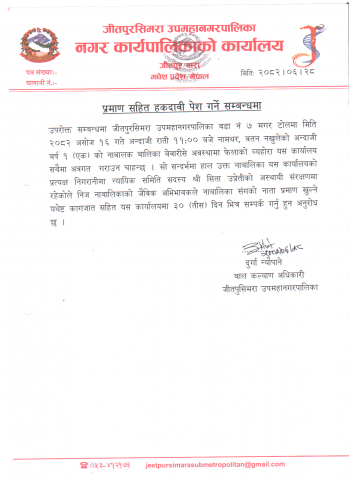 info@jeetpursimaramun.gov.np, jeetpursimarasubmetropolitan@gmail.com