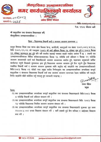 बिद्यालयमा बिद्यार्थी भर्ना र अध्ययन अध्यापन सम्बन्धमा ।