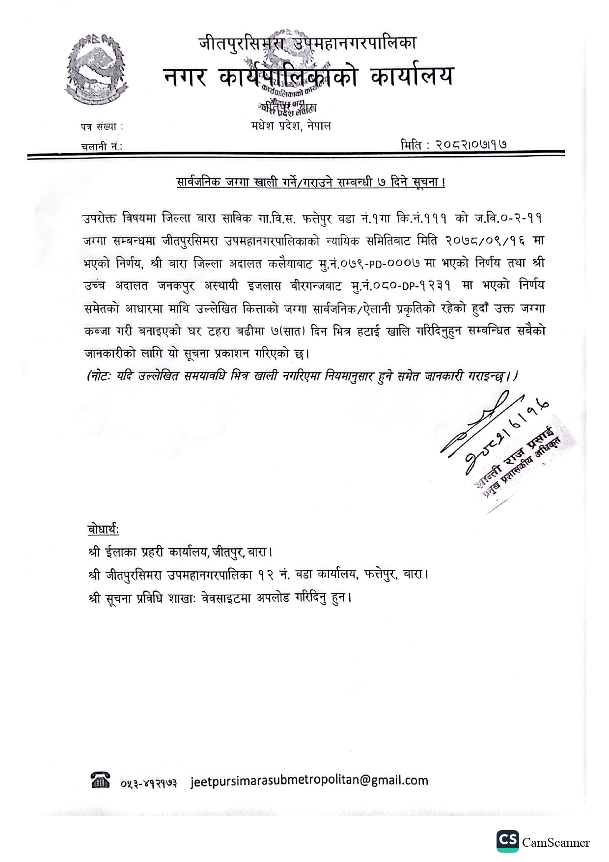 info@jeetpursimaramun.gov.np, jeetpursimarasubmetropolitan@gmail.com