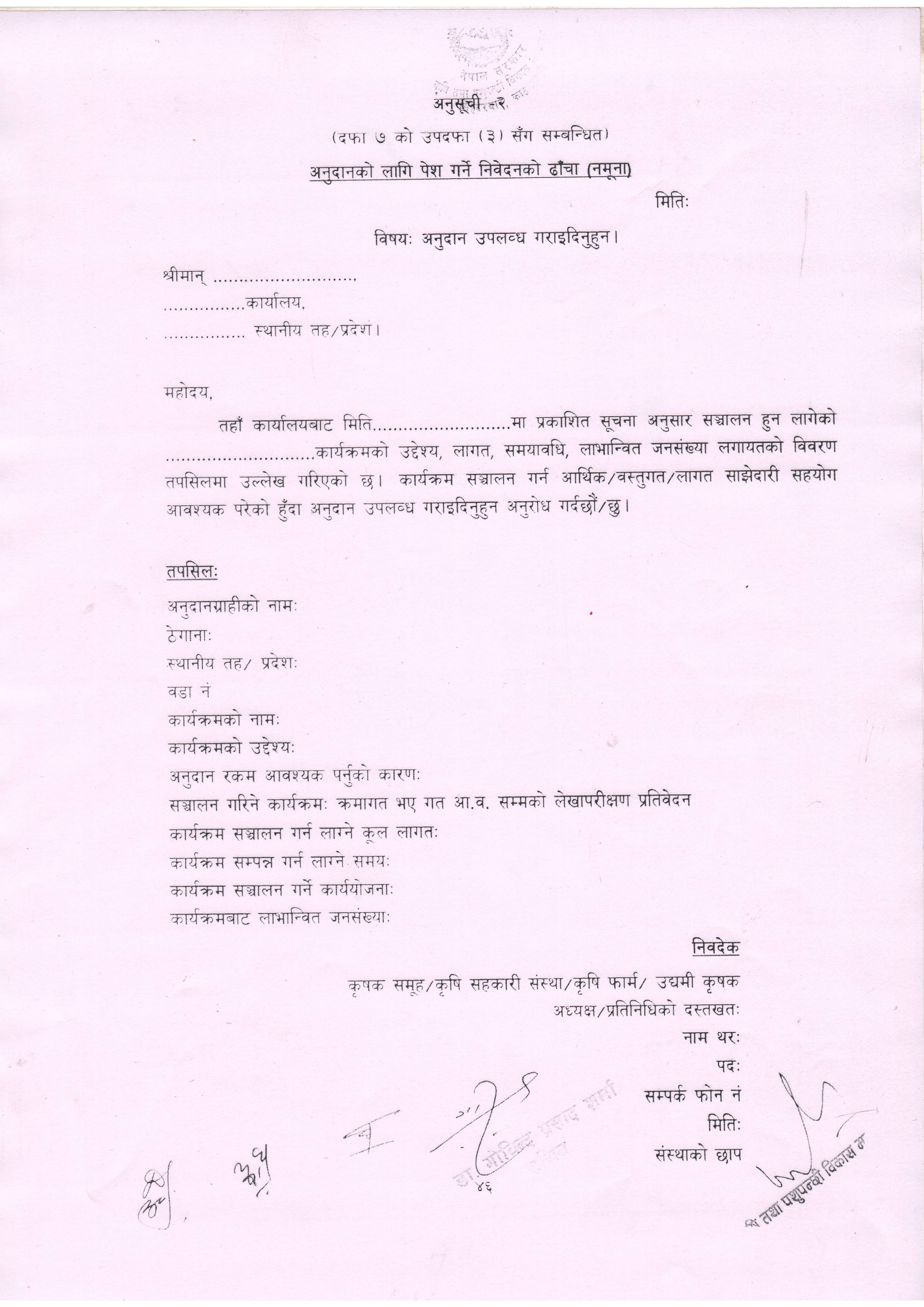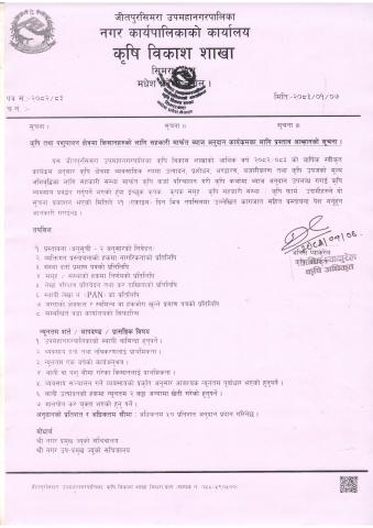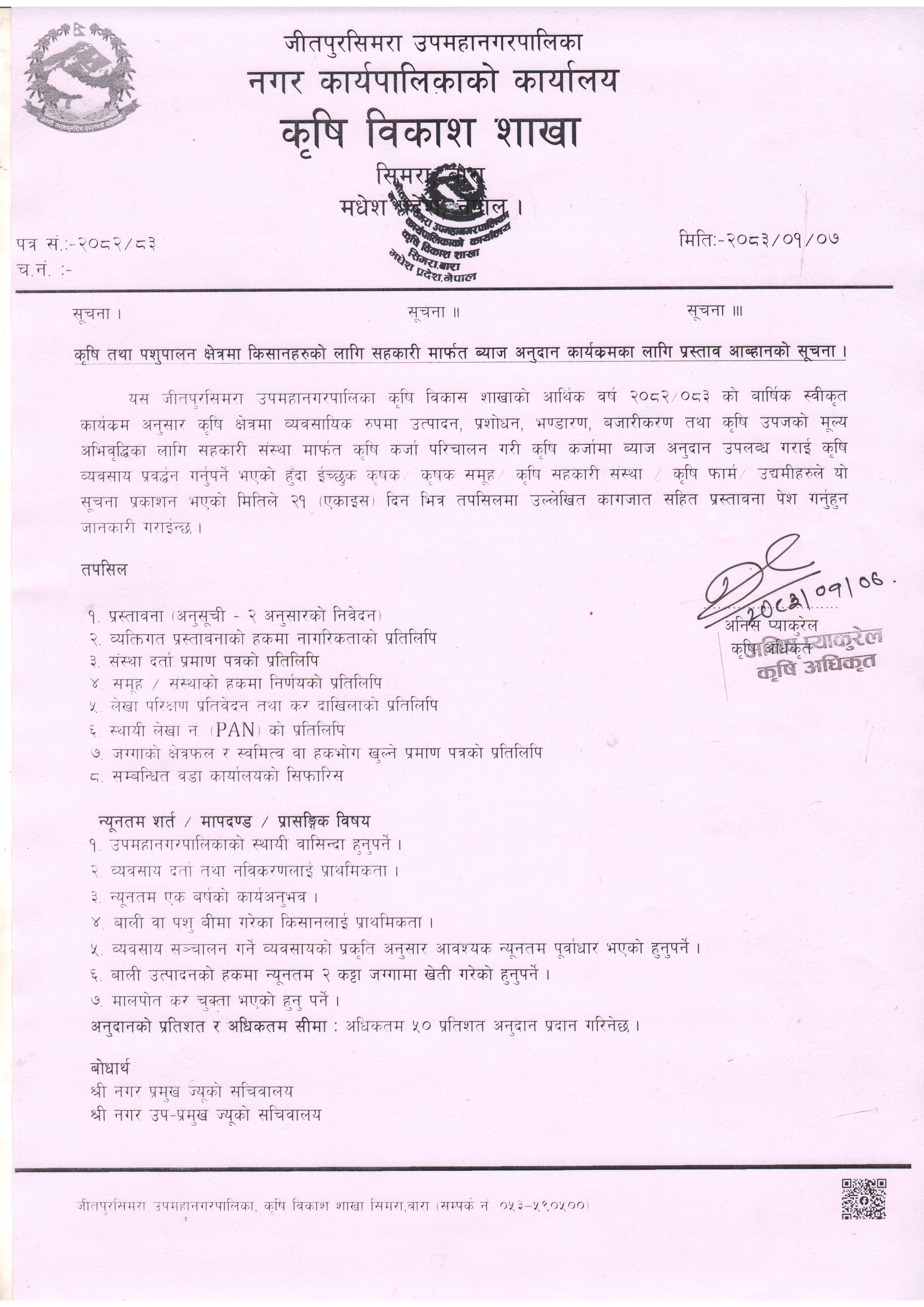 कृषि तथा पशुपालन क्षेत्रमा किसानहरुको लागि सहकारी मार्फत ब्याज अनुदान कार्यक्रमका लागि प्रस्ताव आब्हानको सूचना ।