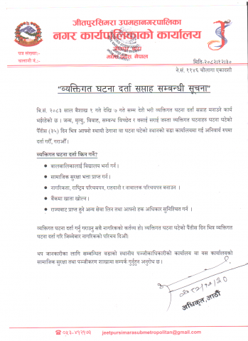 » व्यक्तिगत घटना दर्ता सप्ताह सम्बन्धी सूचना ।