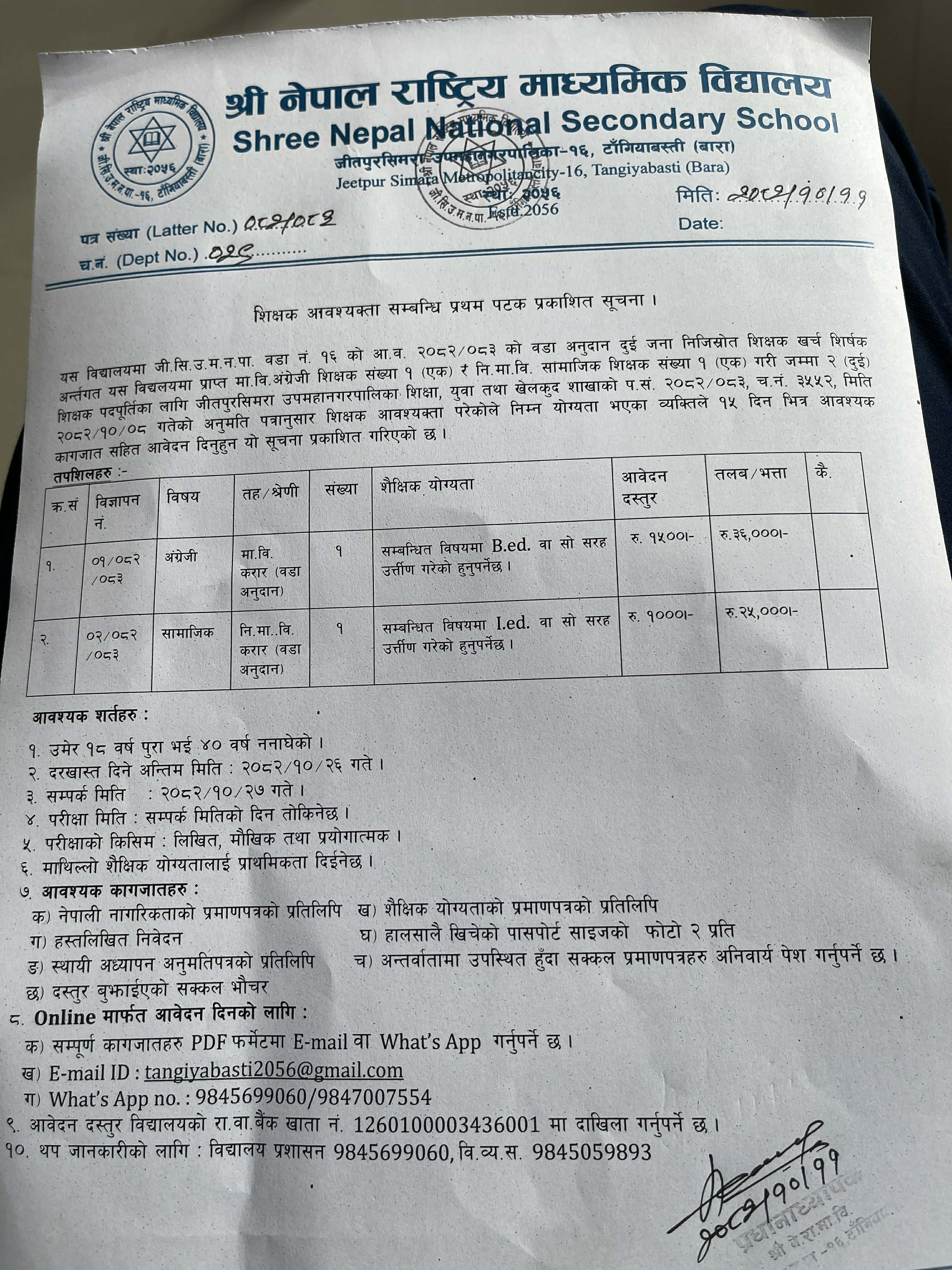 शिक्षक आवश्यक्ता सम्बन्धि सूचना ।