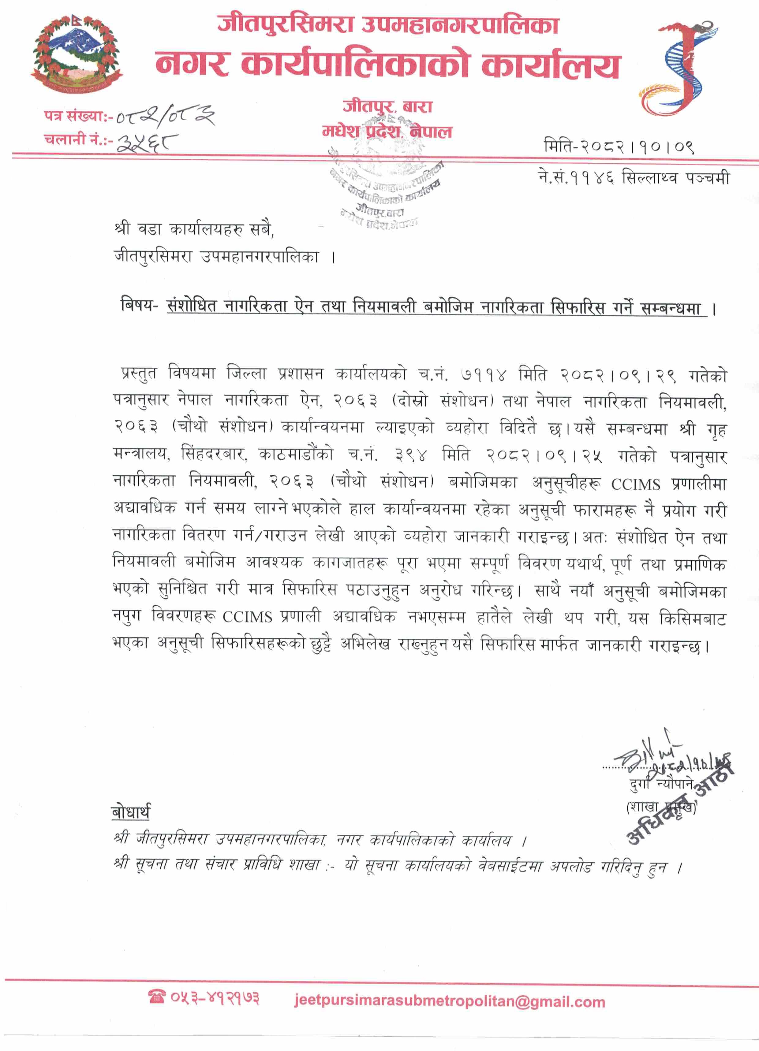 » श्री वडा कार्यालयहरु सबै, संशोधित नागरिकता ऐन तथा नियमावली बमोजिम नागरिकता सिफारिस गर्ने सम्बन्धी सूचना ।